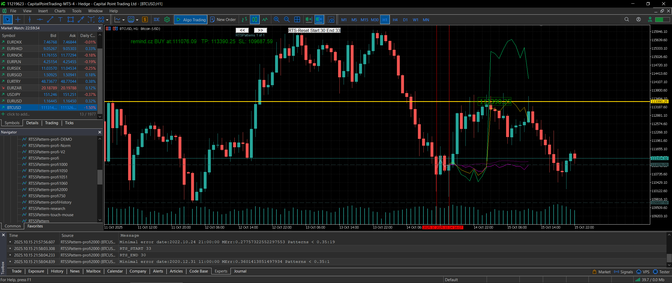 RTS5Pattern-profi is an interactive pattern-matching indicator designed for statistical price projection in MetaTrader 5.